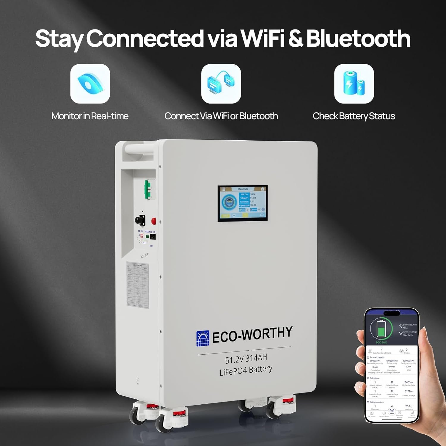 - Multi-channel monitoring: Equipped with a 7-inch full-color display (800×480) for real-time battery status monitoring, and supports Bluetooth/Wi-Fi remote viewing of real-time status and communication settings. Features RS232, RS485, and CAN interfaces, enabling automatic overnight charging when paired with an ECO-WORTHY inverter