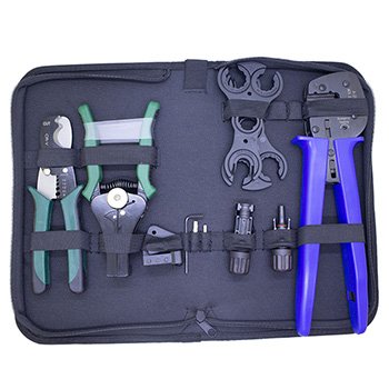 Solar Crimping Tool Kit is a professional tool for the installation and replacement of photovoltaic connectors, including wire cutters, crimpers, strippers, wrenches, and a pair of PV connectors.